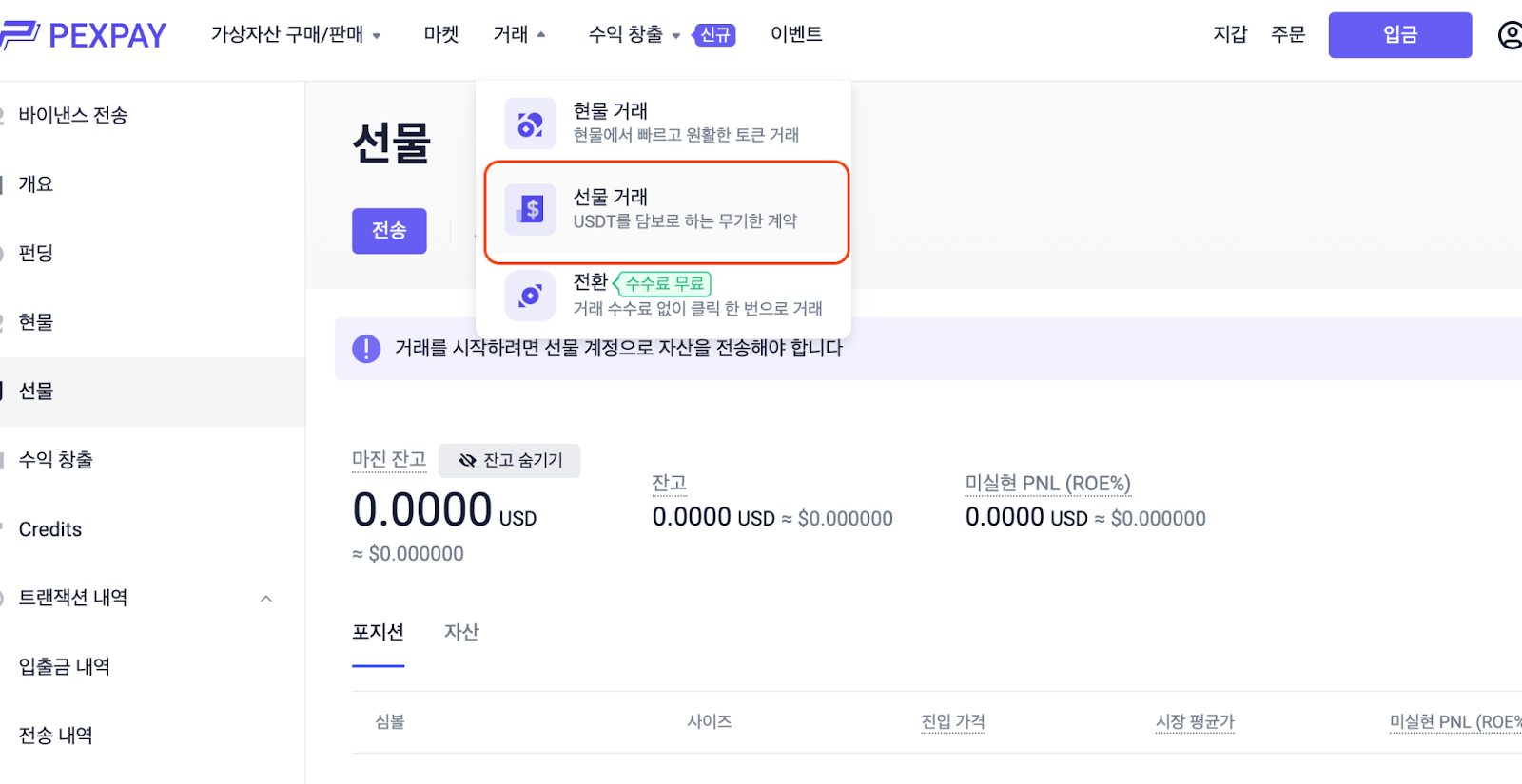 이제 자금을 PEXPAY 선물 지갑으로 이체했으므로 첫 거래를 할 준비가 되었습니다. [거래]로 이동하여 PEXPAY 홈페이지에서 [선물 거래]를 클릭합니다.