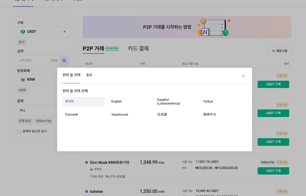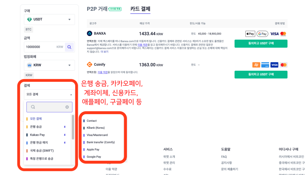 또한 P2P 거래에서 원화 결제 시 카카오페이, 케이뱅크, 애플페이, 구글페이, 신용카드 결제가 가능하여 결제 방법에 구애 받지 않고 가상화폐를 구입할고, 또 판매할 수 있습니다.