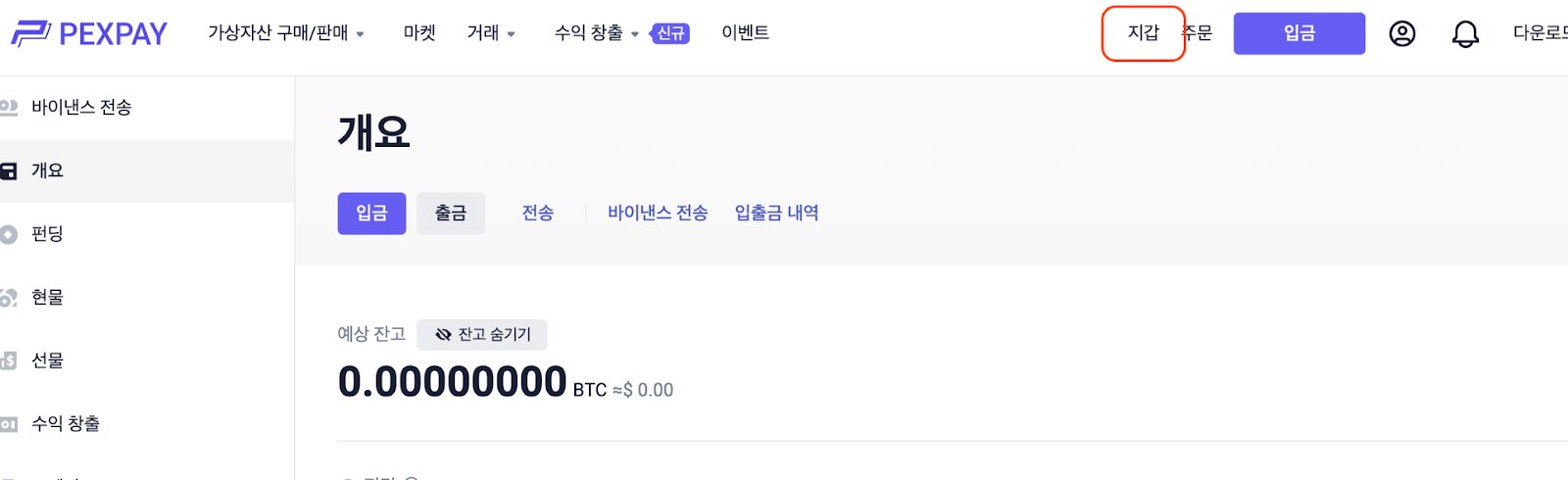 만약 USDT 구매를 완료했다면, 페이지 우측 상단의 [지갑]을 클릭합니다.